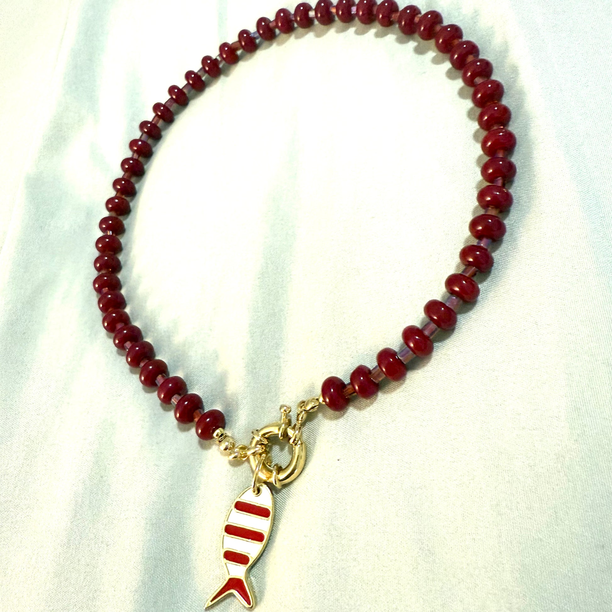 Short necklace made with stainless steel wire, red beads, seed beads, gold plated clasp and enamel fish. 40 cms (16’)