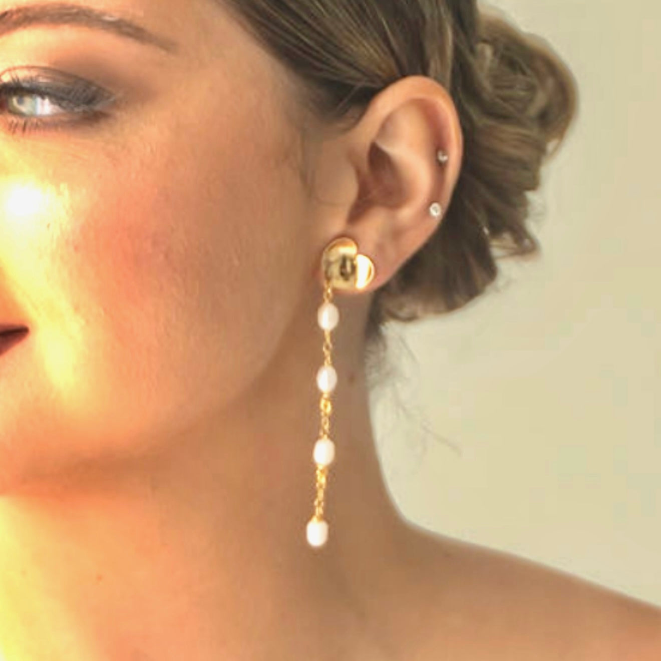Long earrings made with pearls, and gold plated chain, rings and hearts.