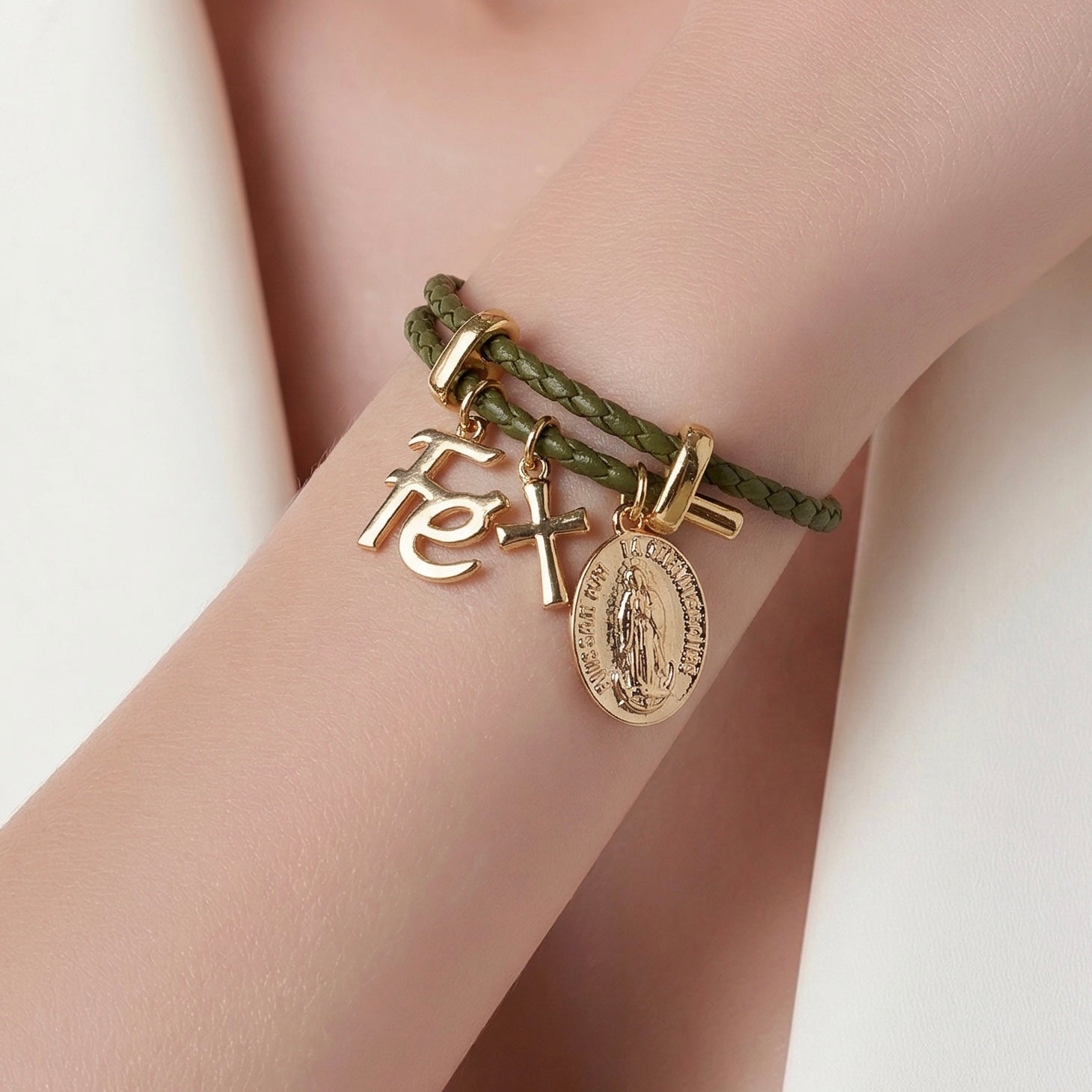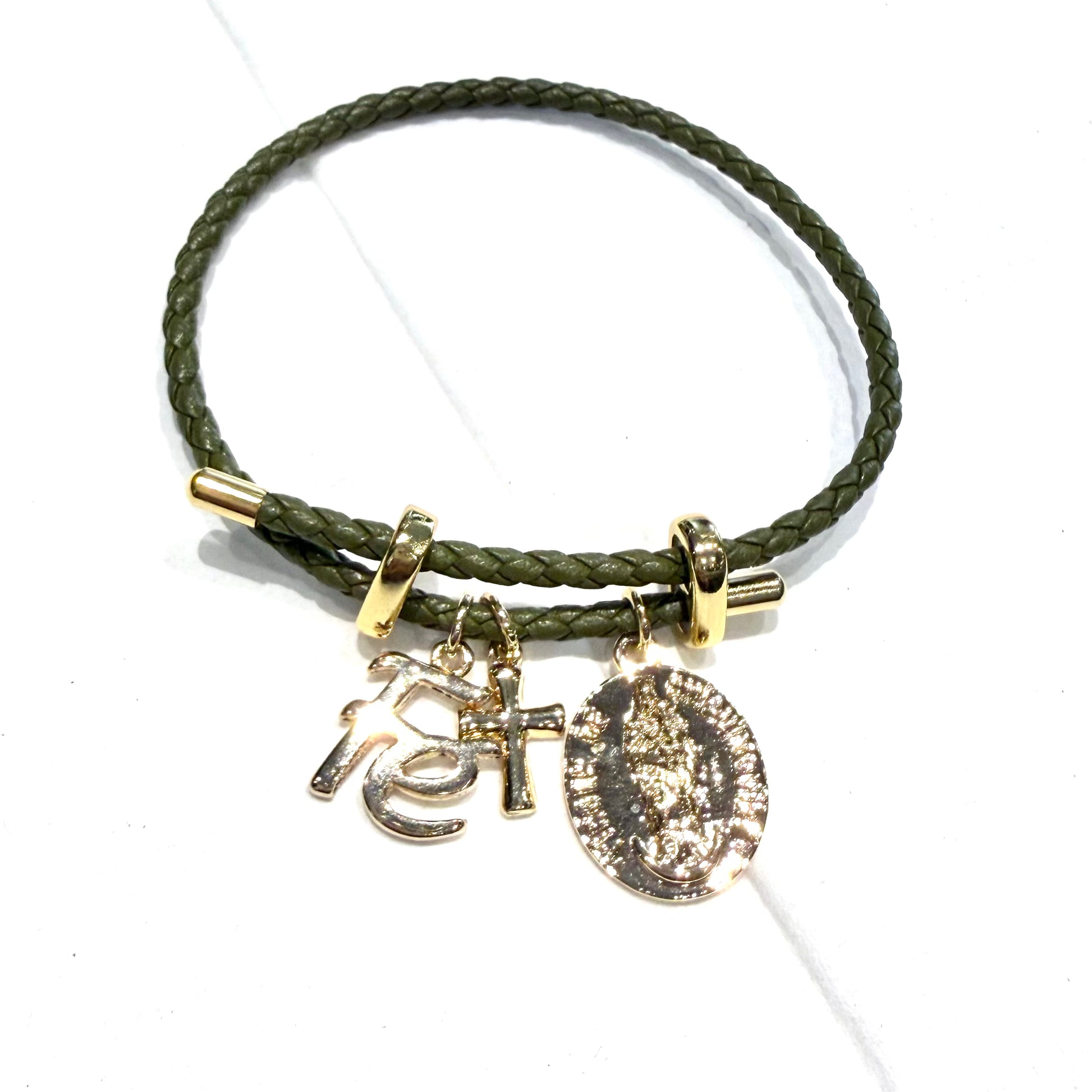Adaptable bracelet made with olive green cord and gold plated charms and beads.