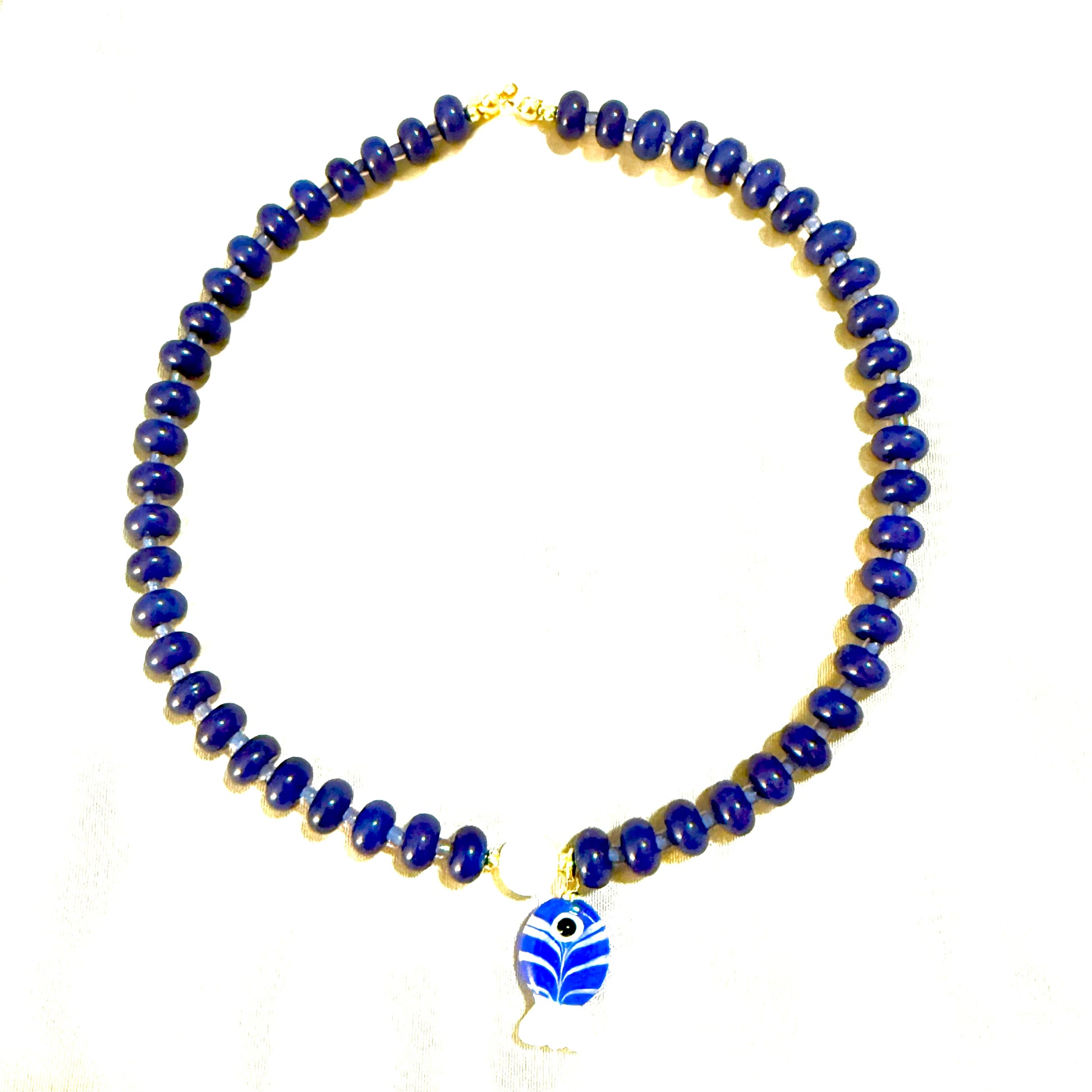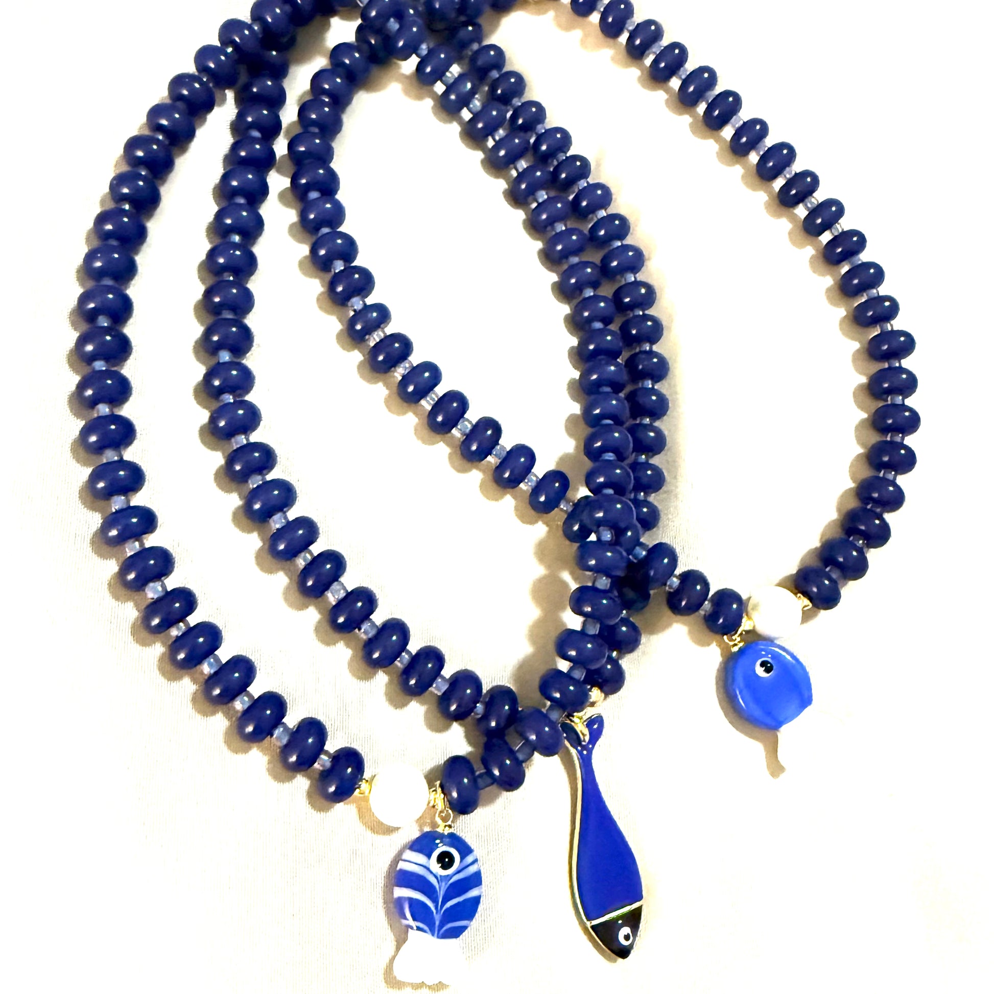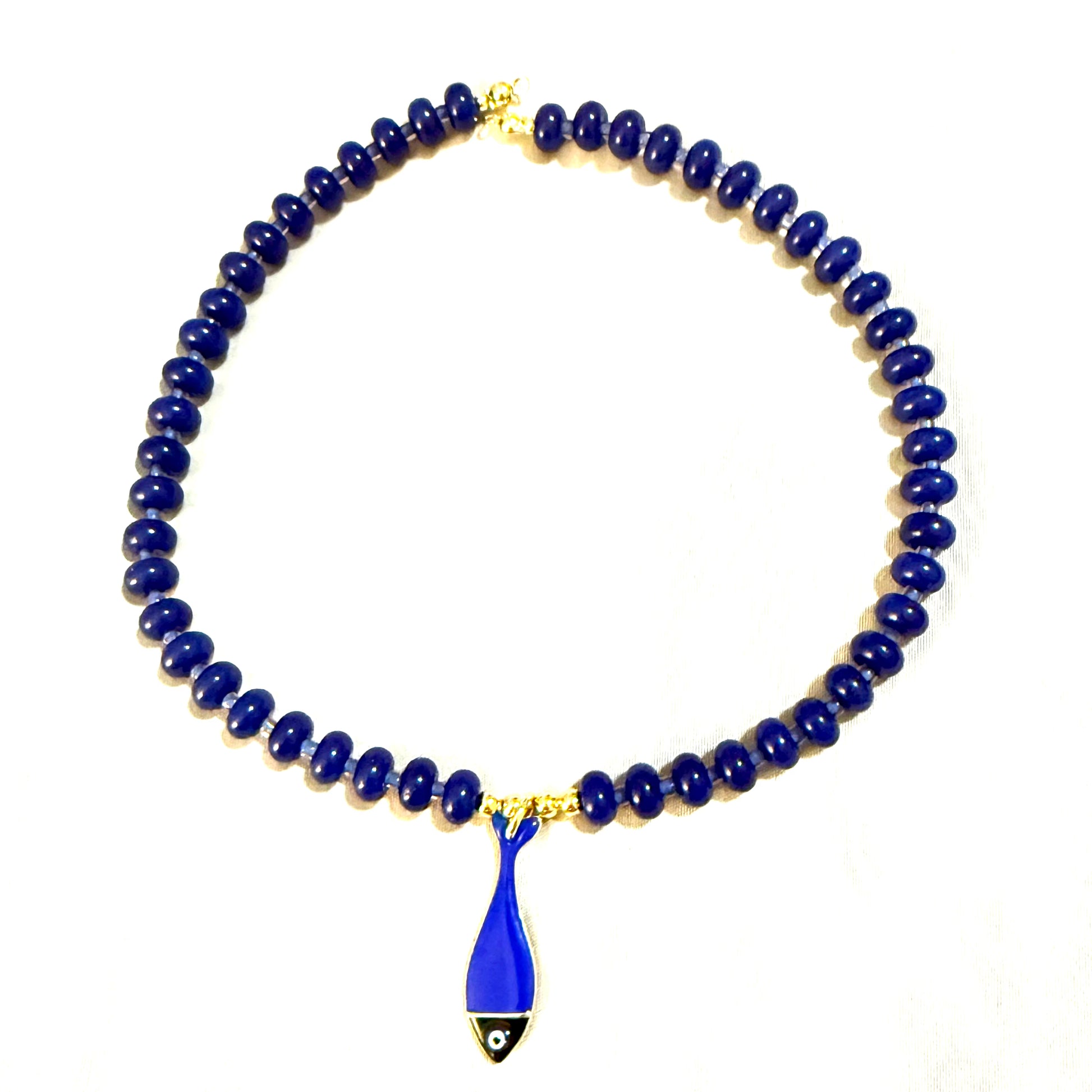 Short necklace made with stainless steel wire, blue beads and seed beads, and blue fish. 40 cms (16’)