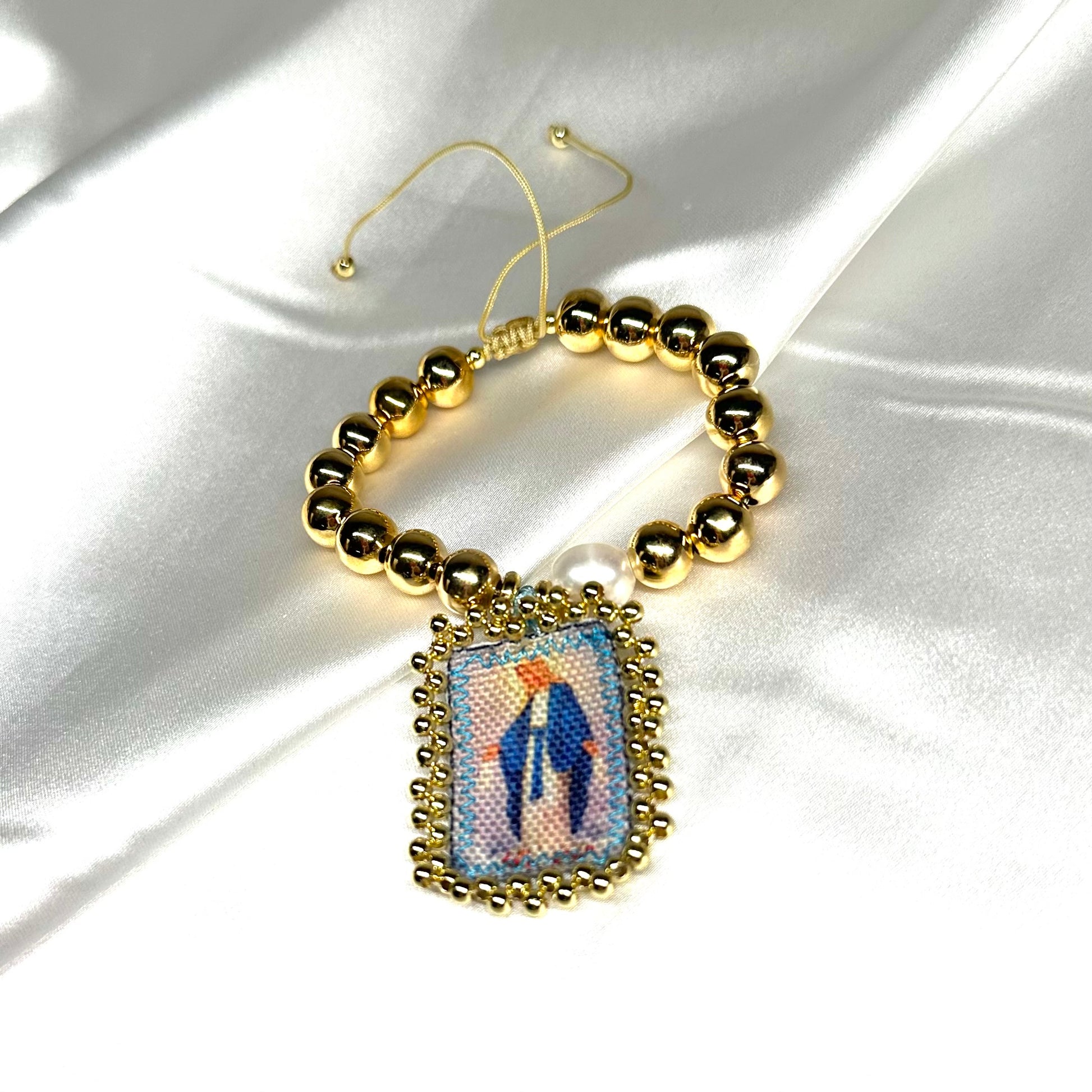 Adaptable bracelet made with beige cord, gold plated beads, pearl and hand made scapular of Milagrosa