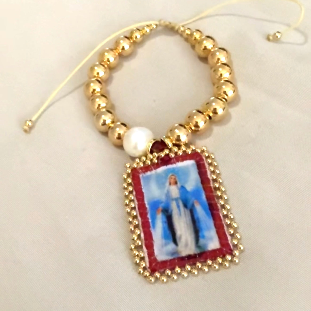 adaptable bracelet made with beige cord, gold plated beads, pearl and scapular of Virgen Milagrosa.