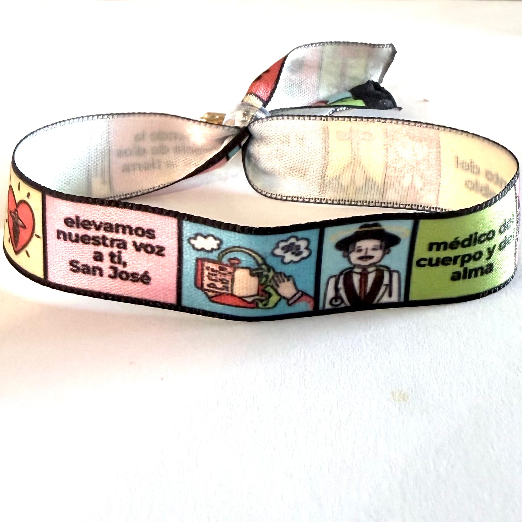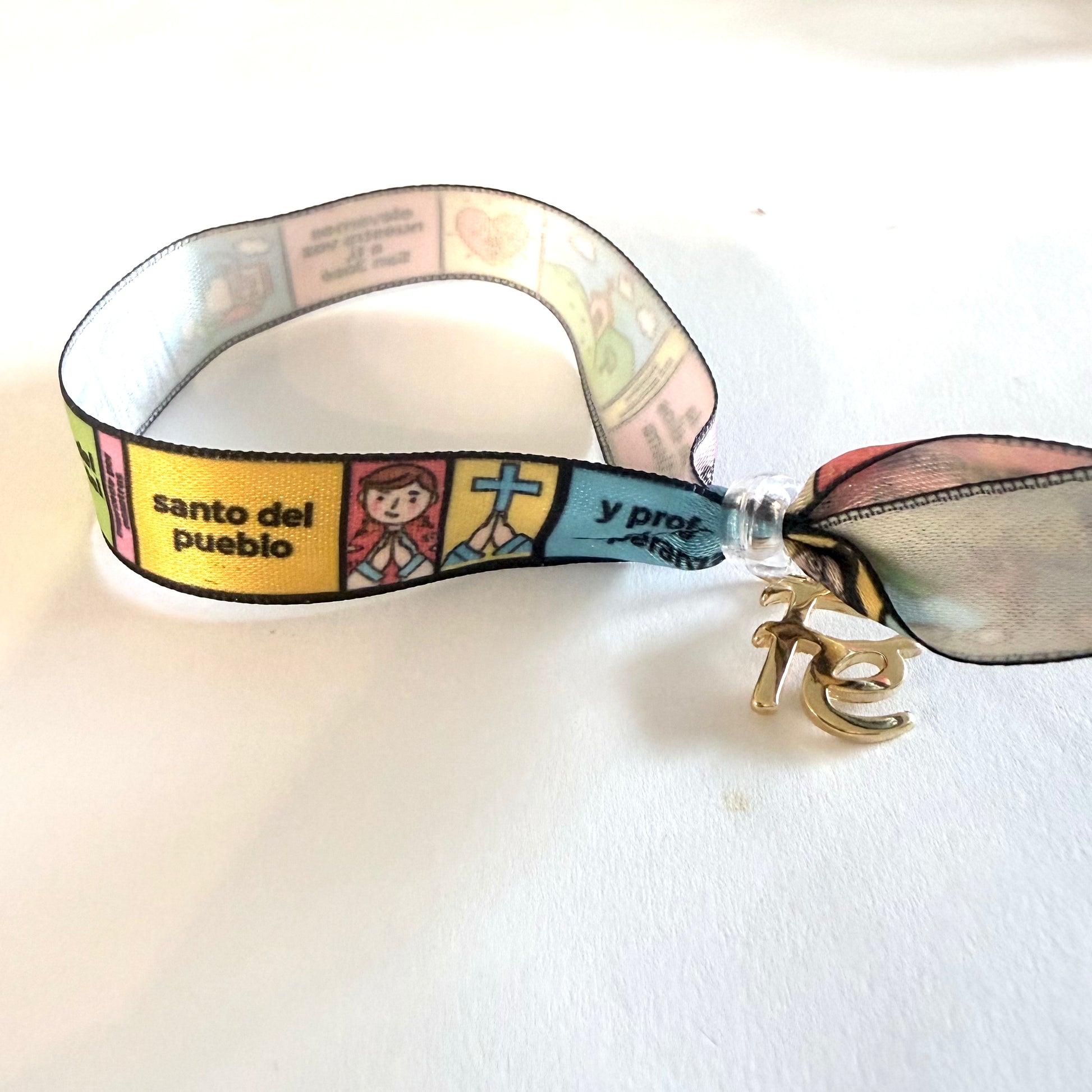 Adaptable ribbon bracelet with painted images about San Jose Gregorio Hernandez, Venezuelan Saint, and gold plated charm of FE.